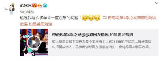 6月5日晚,范冰冰转发了《奇葩说》近期的节目,辩题为“对于谣言该不该澄清?”,并称:“这是我这么多年来一直在想的问题!”节目中,马薇薇表示不要澄清,让自己清者自清。范冰冰在此时发出此微博,被网友猜测可能是替男友回应此事。网友看到范冰冰微博后也纷纷发表自己的观点,留言称:“清者自清。。。“